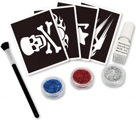 - penseel; 4 sjablonen (herbruikbaar); tattoolijm; glitter in 3 kleuren; handleiding
