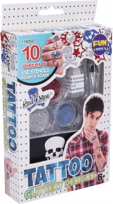 Maak je eigen unieke designs met deze set voor tijdelijke glittertattoos voor jongens. Bevat 4 herbruikbare sjablonen, 3 glitterkleuren, lijm, penseel en handleiding – eenvoudig plezier voor kinderen vanaf 6+.