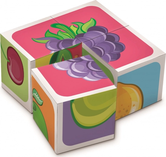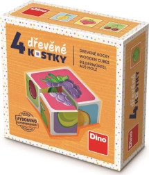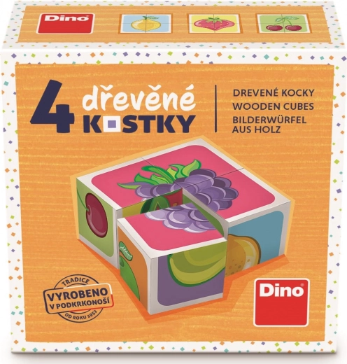 Kleurige houten blokken met fruitmotieven van het merk Dino maken kinderen vanaf 3 jaar blij. Met 4 blokken leg je 6 verschillende afbeeldingen van fruit, of bouw je een kleine toren. Veilig, gemaakt van Tsjechisch sparrenhout, en stimuleert fijne motoriek, verbeeldingskracht en creativiteit.