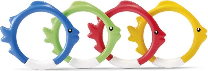 De set duikringen IN TEX in de vorm van vissen is een ideale hulp voor spelenderwijs leren duiken. Dankzij de opvallende kleuren en de stabiele positie op de bodem van het zwembad vinden kinderen gemakkelijk hun doel en oefenen ze graag met adem inhouden en oriëntatie onder water.