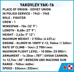 Met deze bouwset kun je een historisch model van het gevechtsvliegtuig Yakovlev Yak-1b bouwen, dat tijdens de Tweede Wereldoorlog in de luchtmacht heeft gediend. Dankzij het elegante ontwerp en eenvoudige onderhoud was het geliefd bij piloten en grondpersoneel. Dit vliegtuig, bekend om zijn uitstekende prestatievermogen dankzij een goede gewichts-vermogenverhouding, was een gevreesde tegenstander in de lucht.