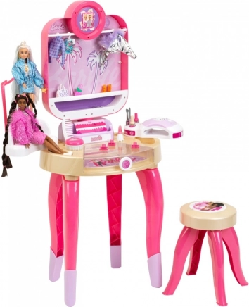 De Barbie kaptafel brengt een authentieke salonsfeer naar de kinderkamer. Dankzij de draaibare spiegel met verlichting kunnen jonge stylisten zich van alle kanten zien en perfecte kapsels creëren. Daarna volgt de speelse “manicure”: de nageldroger met lucht- en lichteffecten geeft het spel een realistische touch.