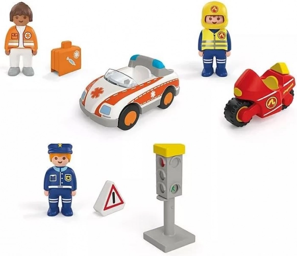 Deze speelse set voor kleine ontdekkers brengt de wereld van hulpverleners rechtstreeks naar de kinderkamer. Kinderen beleven realistische scènes met een arts, een politieagent en een brandweerman op een motor, terwijl ze dankzij het werkende verkeerslicht met kleurwissel de verkeersregels leren.