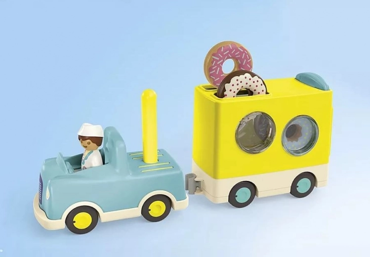Deze kleurrijke set biedt kinderen de eerste stapjes in de wereld van rollenspel: de bestuurder in het blauwe autootje trekt een gele aanhanger versierd met grote donuts. Kinderen kunnen de donuts stapelen en sorteren, hun fantasie gebruiken en eigen verhalen bedenken over een rijdende bakkerij.