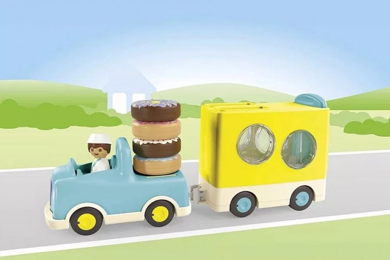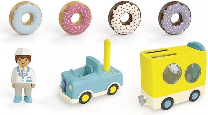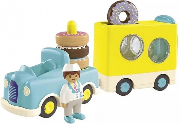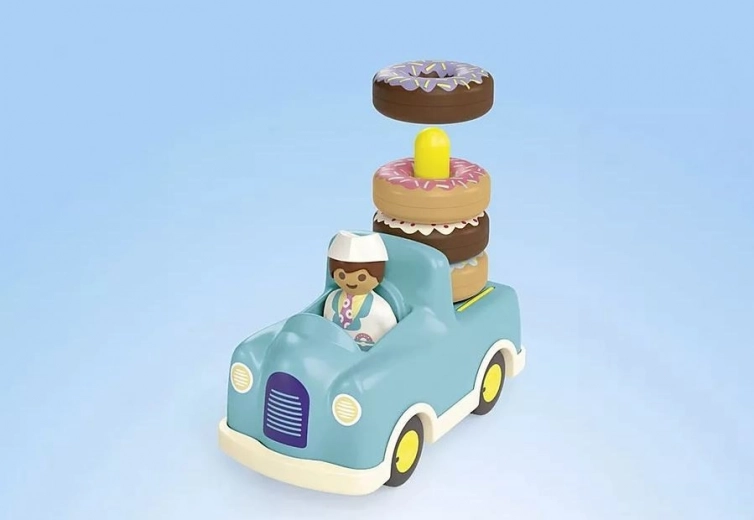 Ontdek de leuke set voor de allerkleinsten – PLAYMOBIL 1.2.3 gekke donuttruck met figuurtje, autootje en aanhanger met stapel- en sorteermogelijkheid. Stimuleert de fijne motoriek, het leren van kleuren en vormen en biedt veilige, creatieve speelpret voor kinderen van 1 tot 4 jaar.