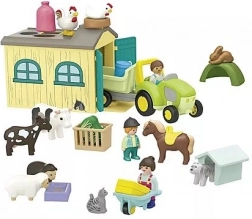 De tractor met haak en de aanhanger met opklapbare zijwand klaren elke klus. De volwassen figuur kan de kruiwagen duwen, het kind kan op de pony zitten, en samen zorgen ze voor de dieren en het erf. De set is te combineren met andere boerderijsets voor een nog grotere fantasiewereld.