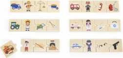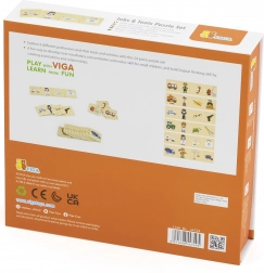 De educatieve set van VIGA bevat 24 houten stukjes met mooie illustraties, waarmee kinderen op speelse wijze kennismaken met 6 beroepen – zoals brandweerman, arts, politieagent, landbouwer, bouwer of bakker – en daarbij de juiste gereedschappen en voertuigen toewijzen. Kleurrijke afbeeldingen ondersteunen het leren van nieuwe woorden en vergroten de woordenschat.