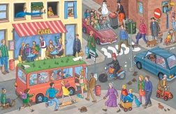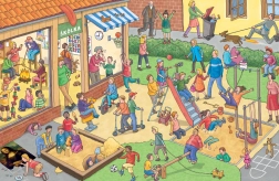 Levende straten, cafés, bussen en een sneeuwpop midden in de zomer – een vrolijke wereld die verbeelding en woordenschat ontwikkelt.