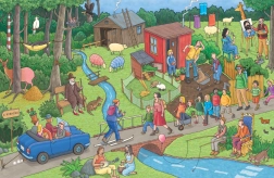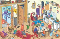 Geïllustreerde huisscènes staan op hun kop en barsten van de details. Kinderen zoeken wat er niet klopt en verzinnen hun eigen verhalen.