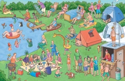 Kamperen, zwemmen en zomerse spelletjes bij de vijver – kleurrijke scènes nodigen kinderen uit hun eigen verhalen te verzinnen.