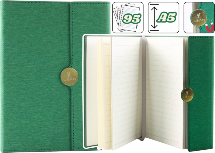 Houd overzicht over je dagelijkse taken met dit stijlvolle groene A5-notitieboek. De stevige kaft met magnetische sluiting blijft veilig dicht, zodat je aantekeningen goed beschermd zijn in je tas en op je bureau. Gelijnde pagina’s met datum en weekdagen helpen je plannen en snel terug te keren naar belangrijke informatie.
