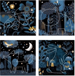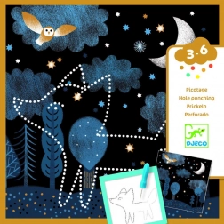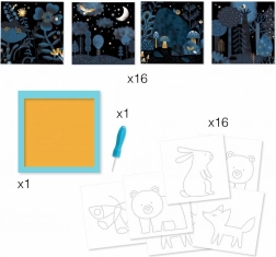 De doos bevat 16 achtergronden, 16 sjablonen, een perforatienaald, een houder en een afbeeldingshandleiding. Materialen van papier en karton met FSC-certificaat.