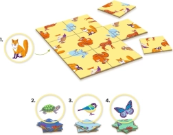 Het spel Sologic Impossiblo – dieren biedt een set van vier originele puzzels, met een geleidelijk oplopende moeilijkheidsgraad. Elke puzzel bevat 9 stevige stukjes en een duidelijk doel: het motief correct samenstellen zodat alle delen perfect in elkaar passen. Ideaal als snelle mentale opwarming of voor langere, geconcentreerde speelmomenten.