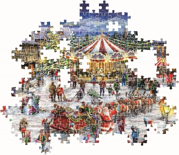 Een gedetailleerde scène van kerstmarkten met een draaimolen, de Kerstman en rijke decoraties brengt bij elke puzzelsessie een feestelijke stemming.