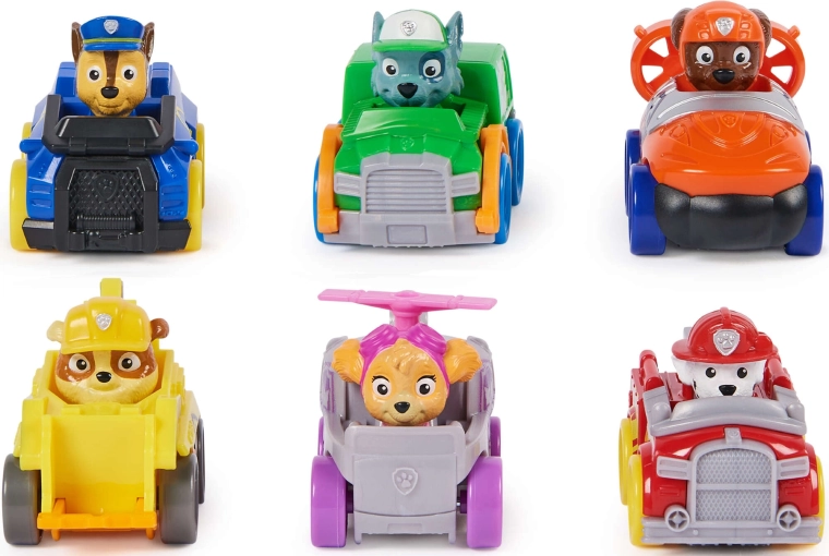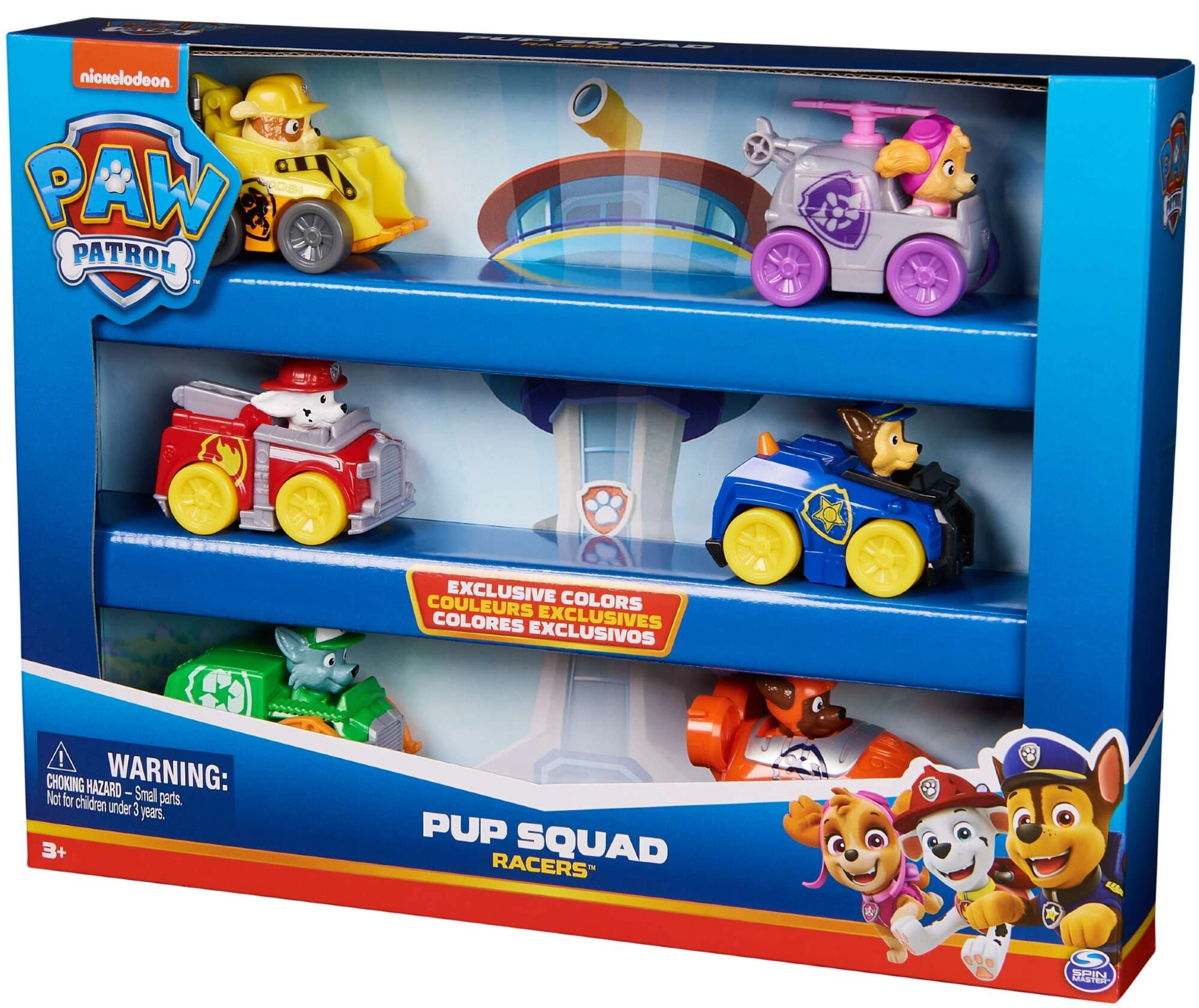 De Pup Squad Racers-set bevat zes gedetailleerde voertuigen met vast bevestigde figuurtjes van de PAW Patrol-helden – Chase, Marshall, Skye, Rocky, Rubble en Zuma. De autootjes zijn gemaakt van duurzaam kunststof, hebben push-and-go aandrijving en zijn dankzij de compacte afmetingen gemakkelijk te bedienen en mee te nemen.