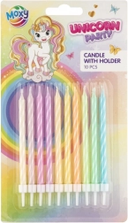 Laat elke verjaardagstaart stralen met het stijlvolle motief van een eenhoorn. De verpakking bevat 10 kaarsjes met praktische houders, lengte van het kaarsje ca. 10 cm.