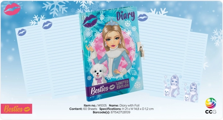 Stijlvol meisjesdagboek met een veilig slot en twee sleutels, ideaal voor geheime notities, dromen en dagelijkse belevenissen. Het heeft 60 gelinieerde bladzijden, een handig formaat van 15 × 21 × 1 cm en een vrolijk winterdesign met het Besties-motief – een meisje met een hondje. Een geweldig cadeau voor kinderen vanaf 5 jaar.