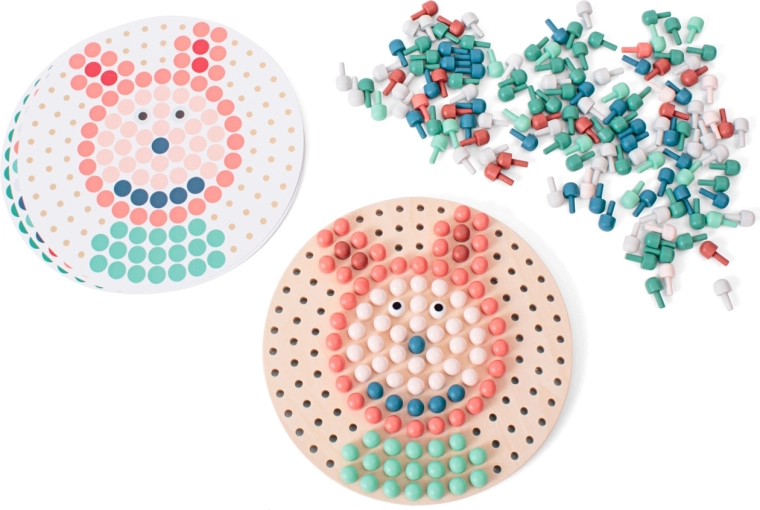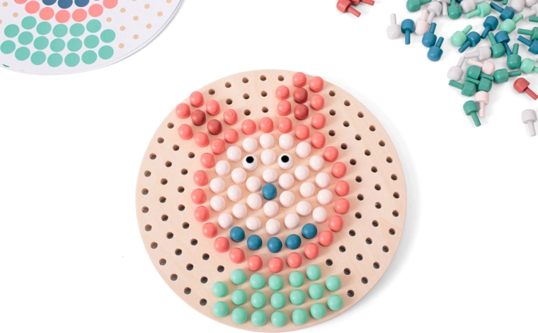 Dit houten mozaïekspel ontwikkelt de vaardigheden van kinderen op speelse wijze. Dankzij het brede palet aan pinnetjes kunnen kinderen afbeeldingen leggen volgens 6 dubbelzijdige sjablonen of eigen, originele patronen maken. Het stevige houten bord en de hoogwaardige materialen zorgen voor een lange levensduur en veilig gebruik.