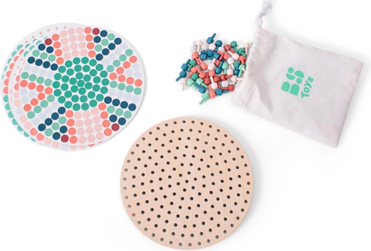 Ontdek een creatieve speelset voor kinderen vanaf 4 jaar: een houten mozaïek met 217 kleurrijke pinnetjes en sjablonen. Stimuleert fijne motoriek, oog-handcoördinatie, logisch denken en creativiteit. Kwalitatief houten bord met een diameter van 19 cm, dubbelzijdige voorbeeldkaarten en een praktische katoenen tas voor eenvoudig opbergen.