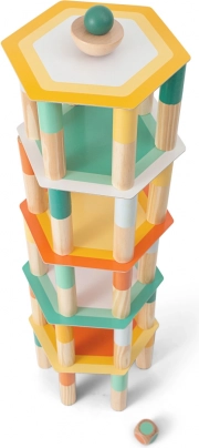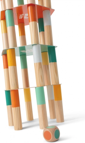 Bouw een hoge toren van gekleurde pilaren en platforms en probeer om de beurt het juiste stuk te verwijderen volgens de kleur op de dobbelsteen. Elke zet is spannend – een ongelukkig gekozen pilaar kan de hele toren en de halve bol bovenop doen vallen. Het spel is gemaakt van hoogwaardig hout en karton, veilig, duurzaam en geweldig voor zowel kinderen als volwassenen.