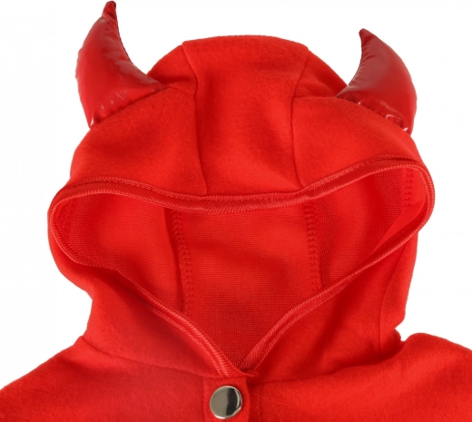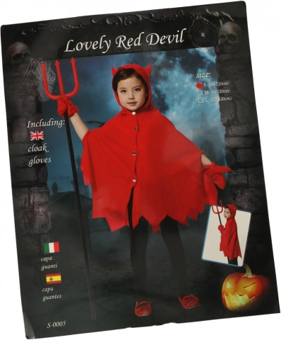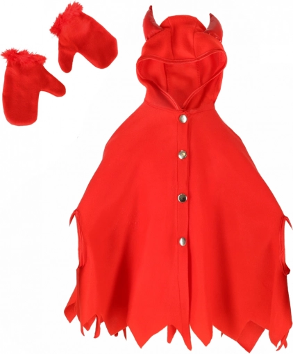 Verander je kind in een ondeugend duiveltje in een oogwenk. De rode cape met capuchon en opvallende hoorns heeft een gekartelde onderzoom en vier drukknoopjes, waardoor hij goed blijft zitten en makkelijk aan en uit gaat. Zachte rode handschoentjes met een pluche rand houden aangenaam warm en maken de duivelse look helemaal af.