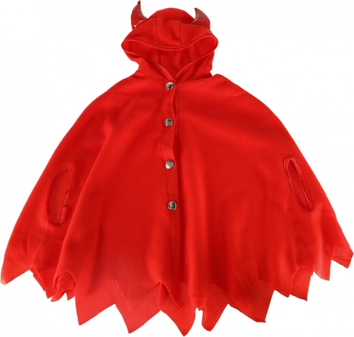 De felrode cape met 4 drukknoopsluitingen en gekartelde zoom geeft het kostuum een uitgesproken duivelse look en blijft toch de hele dag comfortabel.