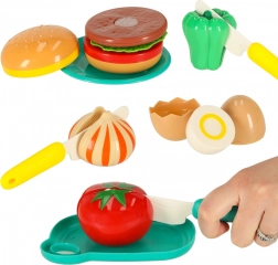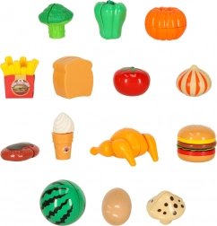 Deze uitgebreide set voor het kinderkookhoekje brengt alles wat kleine koks nodig hebben: pizza in stukken, hamburger, groenten, fruit en zoetigheden. De onderdelen zijn in helften verdeeld en met klittenband verbonden, zodat kinderen veilig kunnen oefenen met snijden, serveren en het samenstellen van een menu voor het hele gezin.