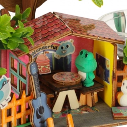 De bouwset combineert hout en plastic voor eenvoudig in elkaar zetten en duurzaamheid. Kinderen oefenen nauwkeurigheid bij het verbinden van onderdelen, leren plantverzorging en maken tegelijk een originele kamerdecoratie. De verpakking bevat ook stickers voor de laatste afwerking van de scène.