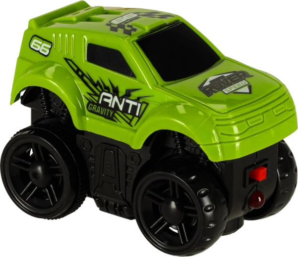 Het groene autootje in de set is speciaal ontworpen om extreme routes aan te kunnen. Dankzij de voeding met twee AA-batterijen beweegt het zelfstandig over de baan zonder problemen.