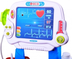De kindermonitor toont een EKG-verloop en begeleidt het spel met licht en geluid, wat het onderzoek een realistische touch geeft en kinderen actief houdt.