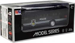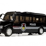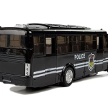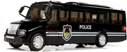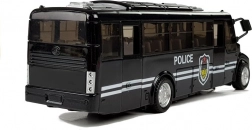 De zwarte uitvoering met opvallende opschriften en transparante ramen benadrukt de realistische look. Dankzij vrij draaiende wielen en details zoals achteruitkijkspiegels oogt de bus als een echt voertuig. Na activatie gaan de lichten branden en klinken sirenegeluiden, wat de sfeer van het actiespel versterkt.