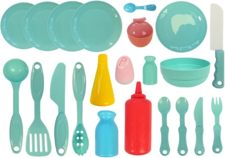 De set bevat een ruime selectie accessoires: pannen en koekenpannen, een dinerset met borden en kopjes, bestek, en ook fruit en groenten om te snijden en te serveren. Het keukentje stimuleert creatief spel, ontwikkelt de fijne motoriek, communicatie en fantasie.