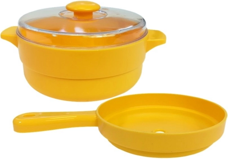 Pan met deksel, koekenpan, bordjes, kopjes en flesjes voor kruiden – alles wat een kleine chef nodig heeft.
