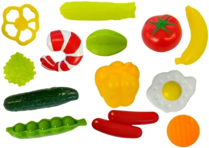 De set kunststof etenswaren in heldere kleuren stimuleert het herkennen van voedsel en het spelen van maaltijdbereiding.