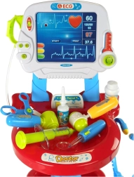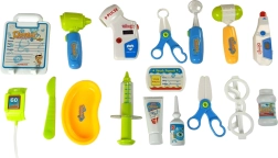 - Trolley/ECG-paneel, bril, stethoscoop met geluid, thermometer met instelling en verlichting, otoscoop met licht, bloeddrukmeter met instelling en verlichting, hamertje, injectiespuit, tandheelkundig spiegeltje met licht, 2× chirurgische schaar, scalpel, bakje, imitatie desinfecterende crème, imitatie oogdruppels, imitatie medicijnpot, doktersnaamkaartje, patiëntenkaart