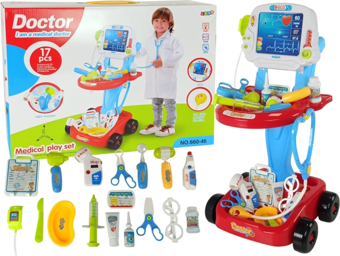 Geef kinderen uren creatief speelplezier met deze rijk uitgeruste set voor kleine dokters. De stabiele trolley op wieltjes met tafeltje, schrijfboard en ECG-functies wordt aangevuld met 17 realistische accessoires zoals een stethoscoop met hartslaggeluid, een oplichtende thermometer en een bloeddrukmeter. Een uitstekende keuze voor de ontwikkeling van fantasie, fijne motoriek en sociale vaardigheden.