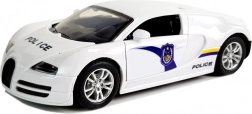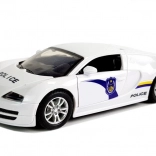 Word een beschermer van de orde met deze compacte politie-sportwagen! Dankzij de pull-back aandrijving, licht- en geluidseffecten en rubberen banden biedt hij dynamisch en veilig speelplezier. De witte uitvoering met blauwe accenten, de opdruk POLICE en getinte ramen geven de auto een echte politielook.