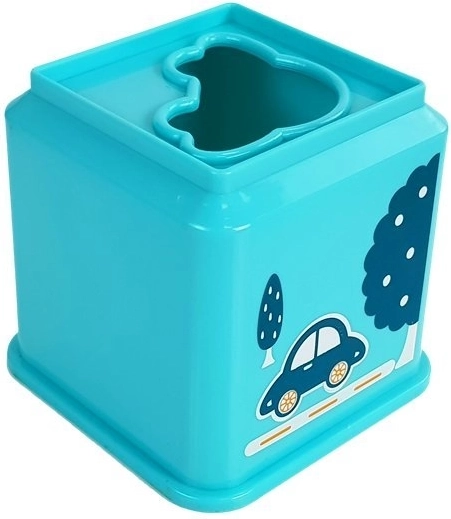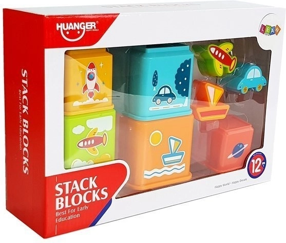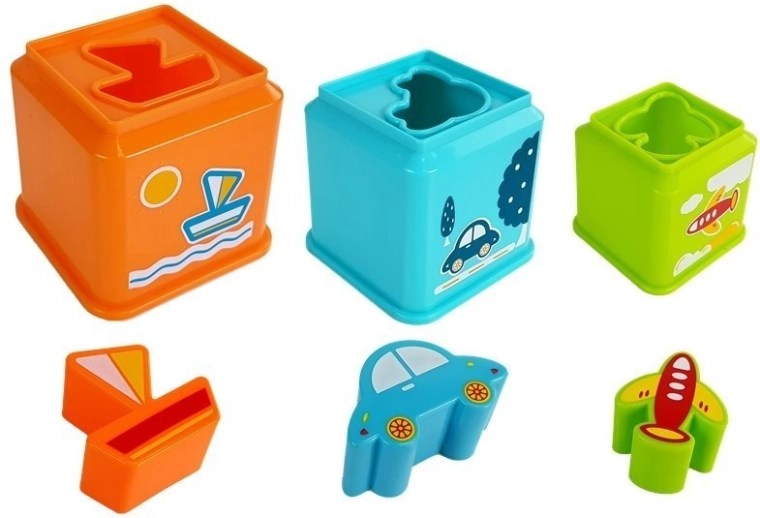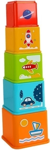Kleurrijke set vierkante bekers met voertuigmotieven voor leuk leren. Kinderen oefenen fijne motoriek, oog-handcoördinatie, logisch denken en het herkennen van kleuren, vormen en cijfers. Elke beker heeft een sorteeropening (sorteerder) om het juiste voertuig toe te wijzen en maakt het mogelijk een hoge piramide te bouwen.