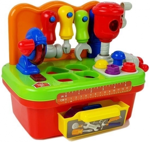 Kleine tools zoals een zaag of boor maken geluiden en hebben een rode LED. Onze kleine werkbank is bovendien uitgerust met een lade waarin je schatten en gereedschap kunt opbergen. Schroeven in de vorm van knoppen ontwikkelen de precisie van je kind. De bankschroef kan volledig ronddraaien. Met deze set leert je kind niet alleen vormen en structuur kennen, maar ook kleuren. Het kan de namen van gereedschappen leren, hoe ze werken, en extra licht- en geluidseffecten maken het spel afwisselender en zorgen voor urenlang plezier. Zo wordt hij een kleine doe-het-zelver.