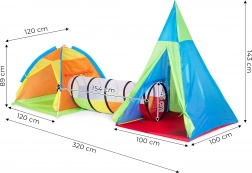 Het monteren van de set is eenvoudig en intuïtief, de constructie van de tenten bestaat uit onderling verbonden buizen; je hoeft ze alleen te koppelen en de hoes uit te spannen. De tunnel is zelfdragend; na het losmaken van de bevestigingsbanden vouwt hij automatisch uit.