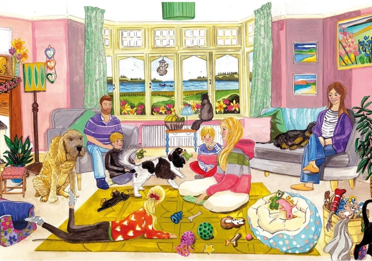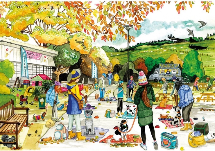 Ontdek vier gedetailleerde illustraties die vrolijke momenten met honden vastleggen – van wandelingen in de natuur tot huiselijke gezelligheid. Elke puzzel met een afmeting van circa 49 × 34 cm biedt een kleurrijke scène en hoogwaardige druk die fijne details en levendige kleuren laat uitkomen. Het leggen verloopt soepel en bevredigend dankzij de precieze stanskwaliteit.