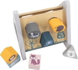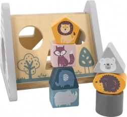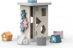 Ontdek een speelse, educatieve speelgoedset voor de allerkleinsten: een houten vormensorteerder in piramidevorm met zachte pasteltinten en dierenillustraties. Kinderen oefenen vormherkenning, fijne motoriek en oog-handcoördinatie, terwijl de veilige houten onderdelen met niet-giftige verf zowel kinderen als ouders een gerust gevoel geven.