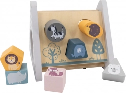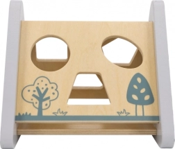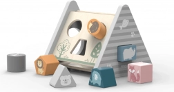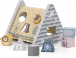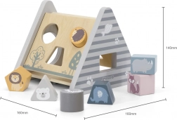 De houten POLARB-sorter in de vorm van een stabiele “A”-piramide biedt diverse uitsparingen om gekleurde blokken met dieren in te passen. Kinderen sorteren vormen en kleuren, leren logica en geduld en beleven veel plezier bij het vinden van de juiste opening.