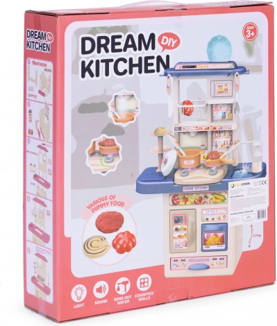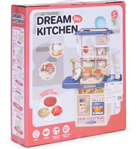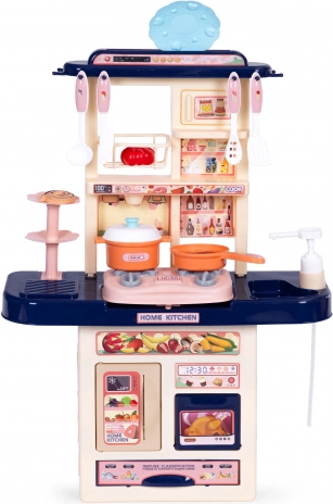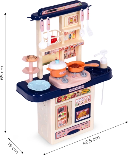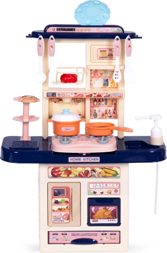 De keuken heeft compacte afmetingen voor eenvoudige plaatsing in de kamer, openende kastjes en opbergruimte voor alle accessoires. Veilig, zonder scherpe randen, geschikt voor kinderen vanaf 3 jaar en groot genoeg om met meerdere kinderen tegelijk te spelen.