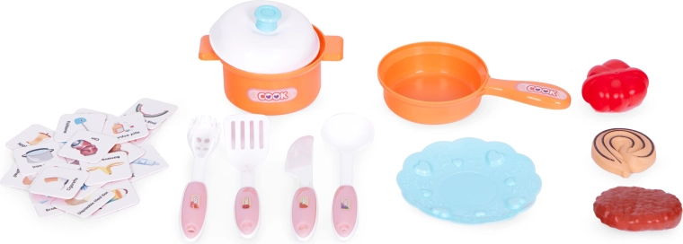 - 10 accessoires: pan met deksel, koekenpan, keukengerei, etenswaren en decoraties.