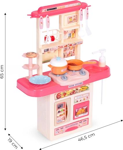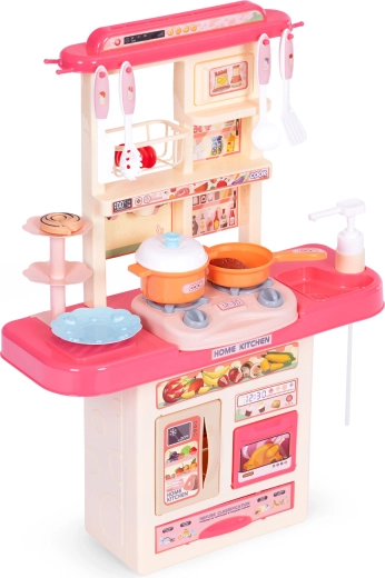 Deze kinderkeuken bootst een echte huishoudkeuken na en motiveert kinderen tot creatief rollenspel als kok. Bij het inschakelen van de kookpitten klinkt het kookgeluid en gaan de rode LED-lichten branden. Je kunt water in het reservoir gieten en via het pompje stroomt er water uit de kraan, wat de realiteit van het spel vergroot.