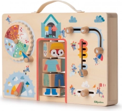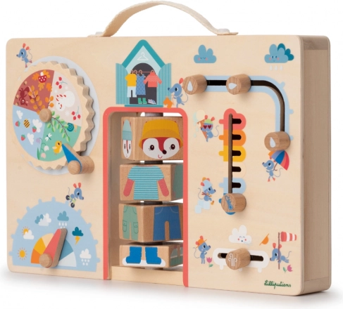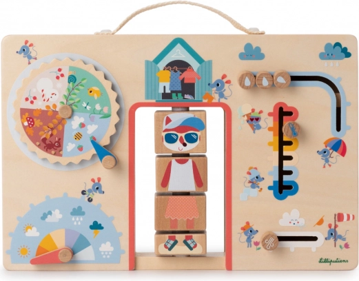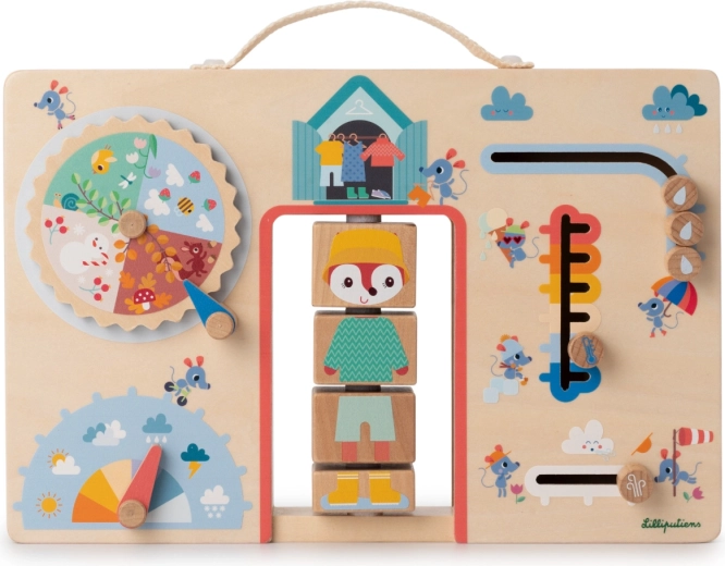Interactief houten paneel met vosje Alice leert kinderen het begrip weer en hoe je je correct aankleedt. Stimuleert fijne motoriek, logisch denken en zelfstandigheid. Draaibare houten blokken laten je kleding kiezen voor zon, wind en winter. Gemaakt van FSC-gecertificeerd hout, eenvoudig te onderhouden en geschikt vanaf 12 maanden.