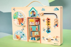 Samen spelen met ouders opent onderwerpen als seizoenen, weersveranderingen en de keuze van geschikte kleding. Het paneel is robuust, afneembaar te reinigen en dankzij het gecertificeerde hout milieuvriendelijk.