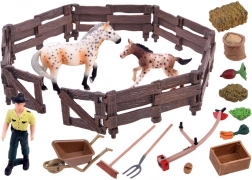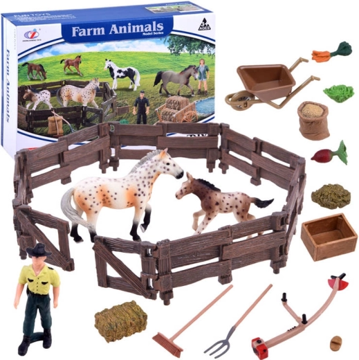 Deze rijk uitgeruste set neemt kinderen mee naar de wereld van de boerderij. Ze vinden er twee natuurgetrouw vormgegeven paardenfiguren (merrie en veulen), een boer, een omheining en tal van accessoires zoals een kruiwagen, riek, hark, voederbak en voer. Realistische details, van de "hout"-textuur op het hek tot de kleuring van de paarden, prikkelen de fantasie en zorgen voor urenlang speelplezier.