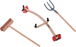 Een boerenfiguur, kruiwagen, hark, riek en andere accessoires voor realistische boerderijklusjes.
